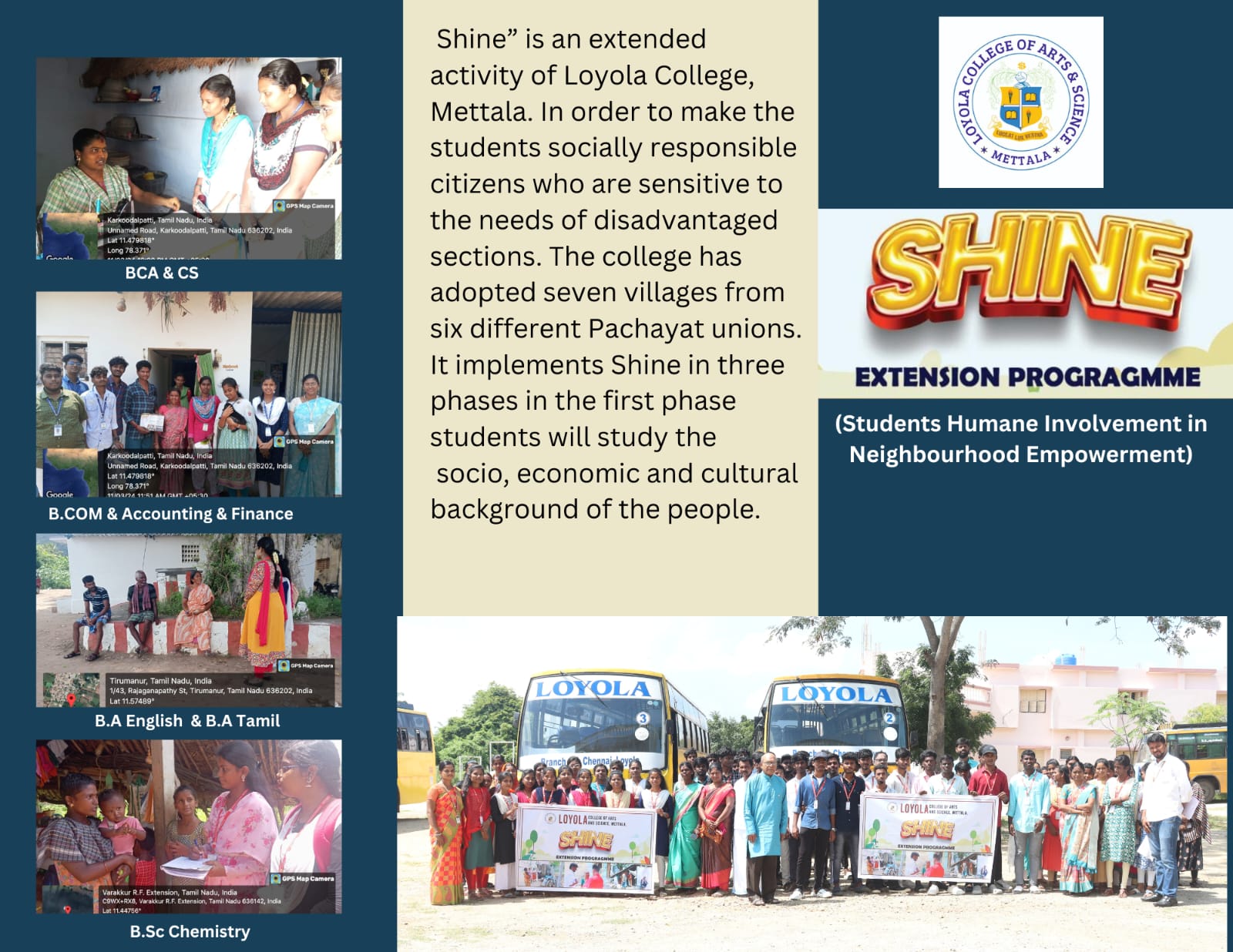 Through SHINE Students are motivated to become socially responsible citizens to be sensitive to the need of disadvantaged sections of the society the college has adopted 10 villages from different Panchayat Unions. Each village is allotted to a department for involvement, interactions,& offer needed services. Students are taken to these villages to become aware of the socio, economic and cultural background of the people. Such a awareness of motivates the students to reach out ,to help the people in need